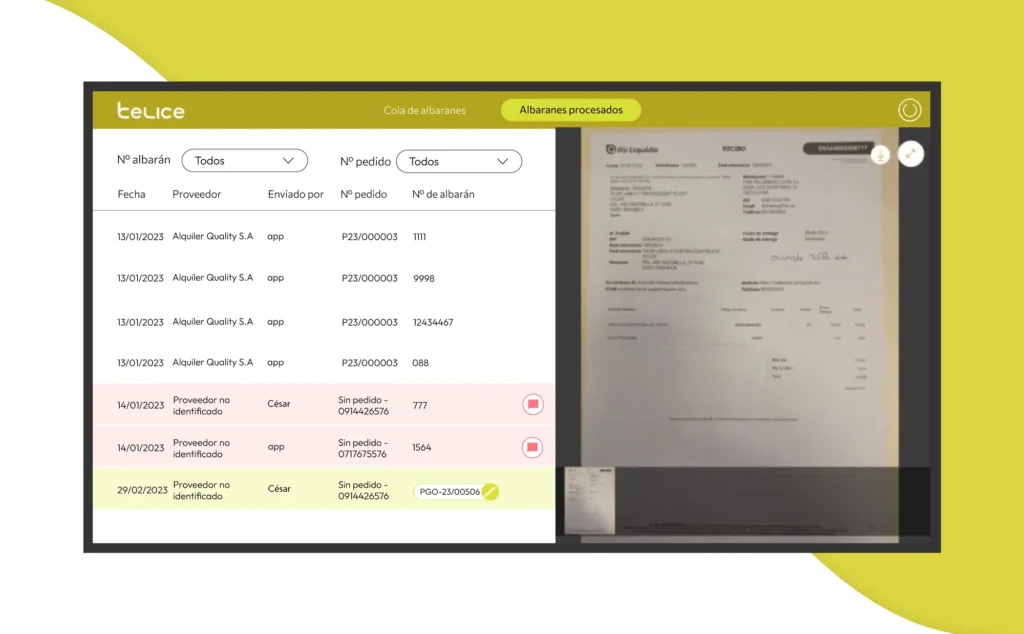 Telice identificó un área clave para mejorar en la recepción de pedidos en obra, donde el proceso de confirmación de entrega y validación de albaranes era prolongado y generaba problemas en la facturación y reclamaciones de entrega.